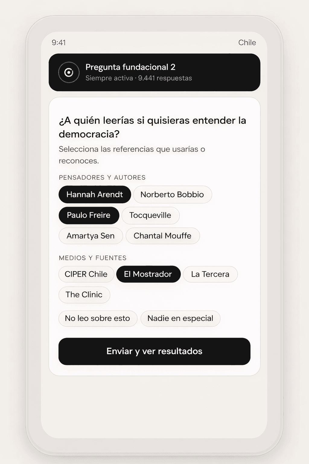 Herramienta de medición en tiempo real de lo que piensan en Chile sobre política, democracia y vida pública. Mide opinión sin orientarla, con datos útiles para investigación y política pública.